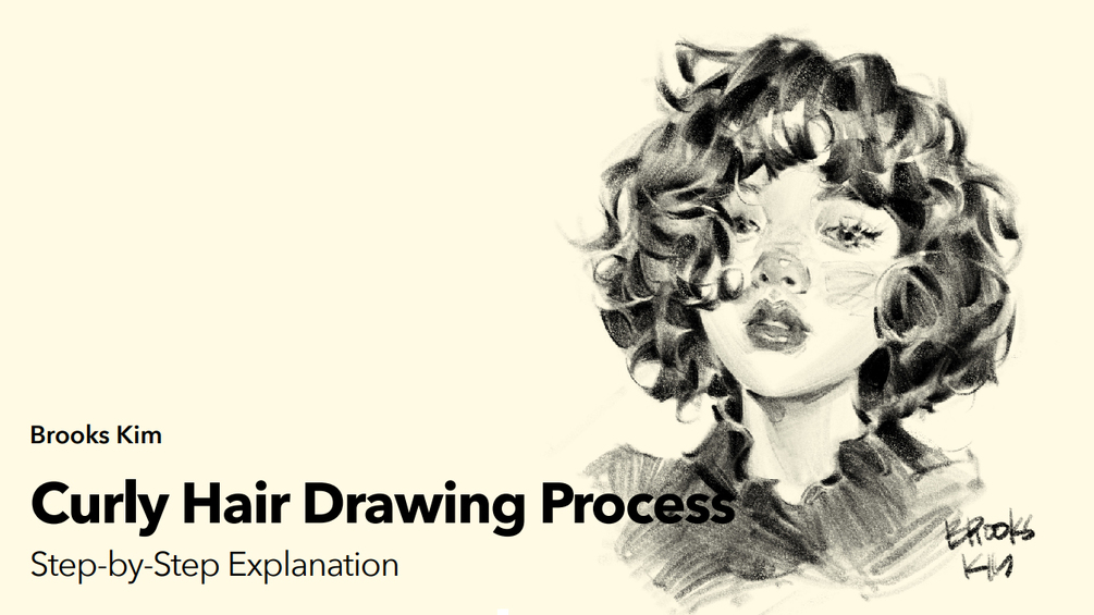 The tutorial focuses on understanding curly hair as a mass, building rhythm with shape, and preserving overall value structure — not just drawing one strand at a time.